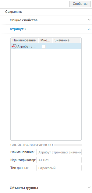 В таблице отображается список добавленных атрибутов группы пользователей с заданным наименованием, идентификатором и типом данных.