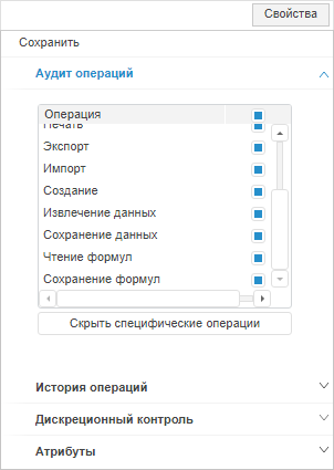 В списке общих операций содержится строка и кнопка «Специфические операции»/«Показать специфические операции», которая определяет настройку аудита по специфическим операциям.