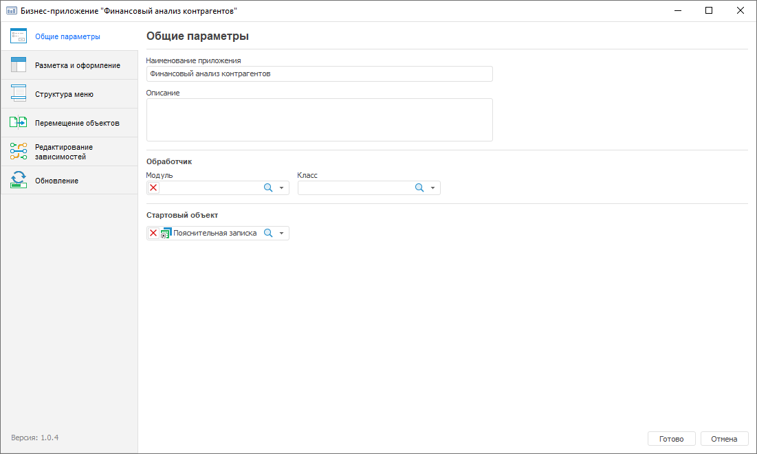 По умолчанию будет открыт первый раздел конструктора бизнес-приложений   «Общие параметры».