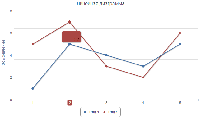 После выполнения примера на html-странице была размещена линейная диаграмма с возможностью отображения для выбранной точки значения на оси X, и со всплывающей подсказкой, следующей за указателем мыши.
