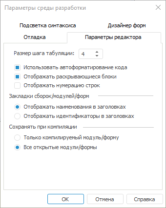 В области «Закладки сборок/модулей/форм» выбирается формат отображения вкладок открытых объектов среды разработки. По умолчанию в заголовках отображаются наименования открытых объектов;