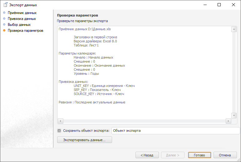 На странице «Проверка параметров» отображает заданные настройки и предназначена для выполнения экспорта данных.