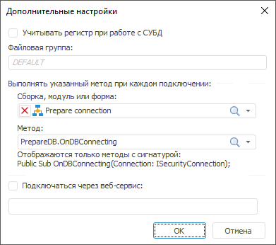 После выполнение действий будут заданы дополнительные настройки подключения к базе данных.
