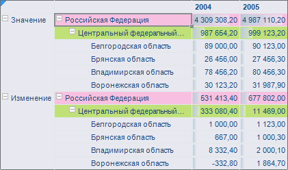 Рассмотрим область данных, для которой включено произвольное размещение, заданы дополнительные наименования элементов измерения, для заголовков и данных элементов заданы идентичные оформления: