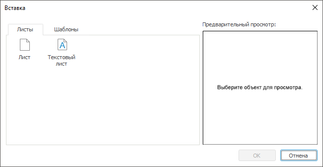 выполните команду контекстного меню «Добавить лист» на вкладке листа. После выполнения действия будет открыто окно «Вставка»: