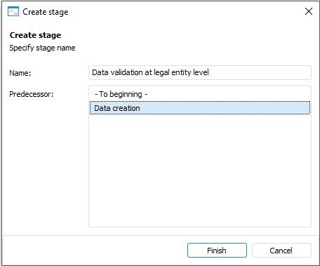 In the Predecessor list select name of the predecessor stage or select the "- To beginning -" element. If the "- To Beginning -" element is selected, the new stage is added to the process start.