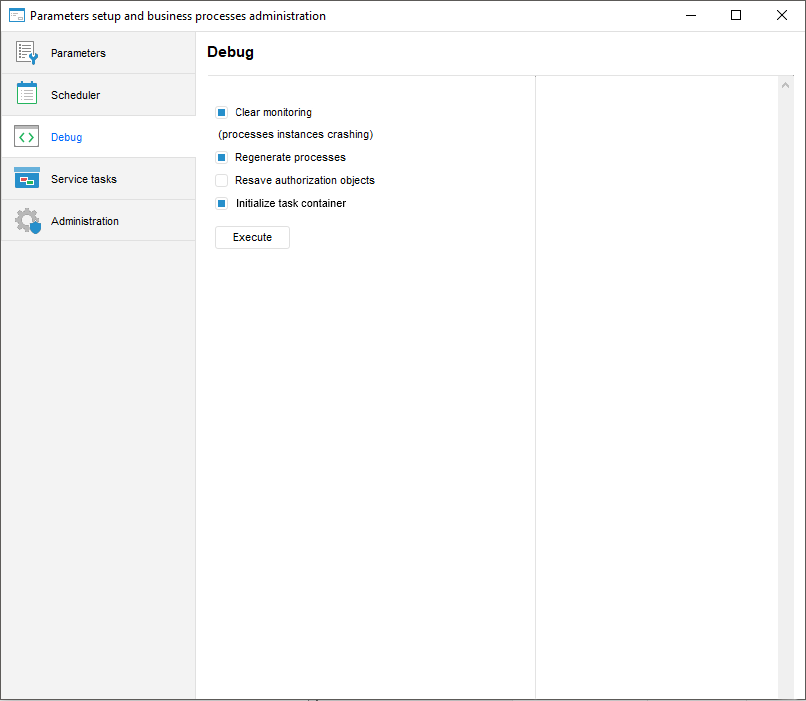 Debug setup is used to clear monitoring, regenerate processes, resave authorization objects and initialize tasks container.All operations of business processes debug are executed on the local computer regardless the selected type of processes execution. To set up business processes debug, use the Debug page.