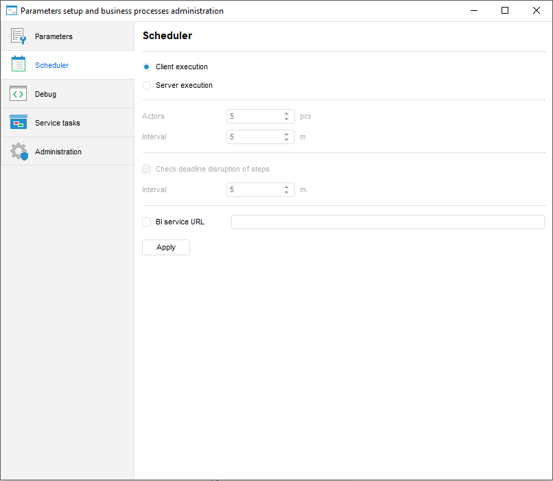 Scheduler setup for business processes includes business processes execution type definition, parameters setup for processes server execution and BI service URL specification.To set up scheduler, use the Scheduler page.