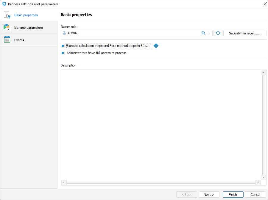 Process parameters are used to start process for execution with specified parameter values, for example: organization structure units, plan versions, currencies. Process parameters are set up in the Process Settings and Parameters dialog box.