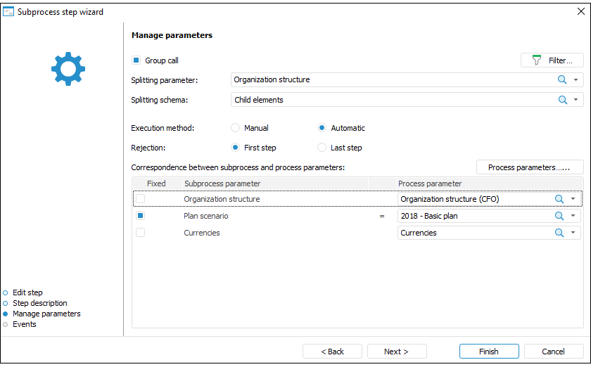 Process Parameter. In the Process Parameter drop-down list select parameter or parameter attribute of the main process.If the Group Call checkbox is selected, select a dictionary corresponding to subprocess parameter in the drop-down list. The dictionaries selected as a process and subprocess must have identical structure. If one dictionary is a division parameter by several process parameters, add it several times in the Process Settings and Parameters dialog box for each parameter.