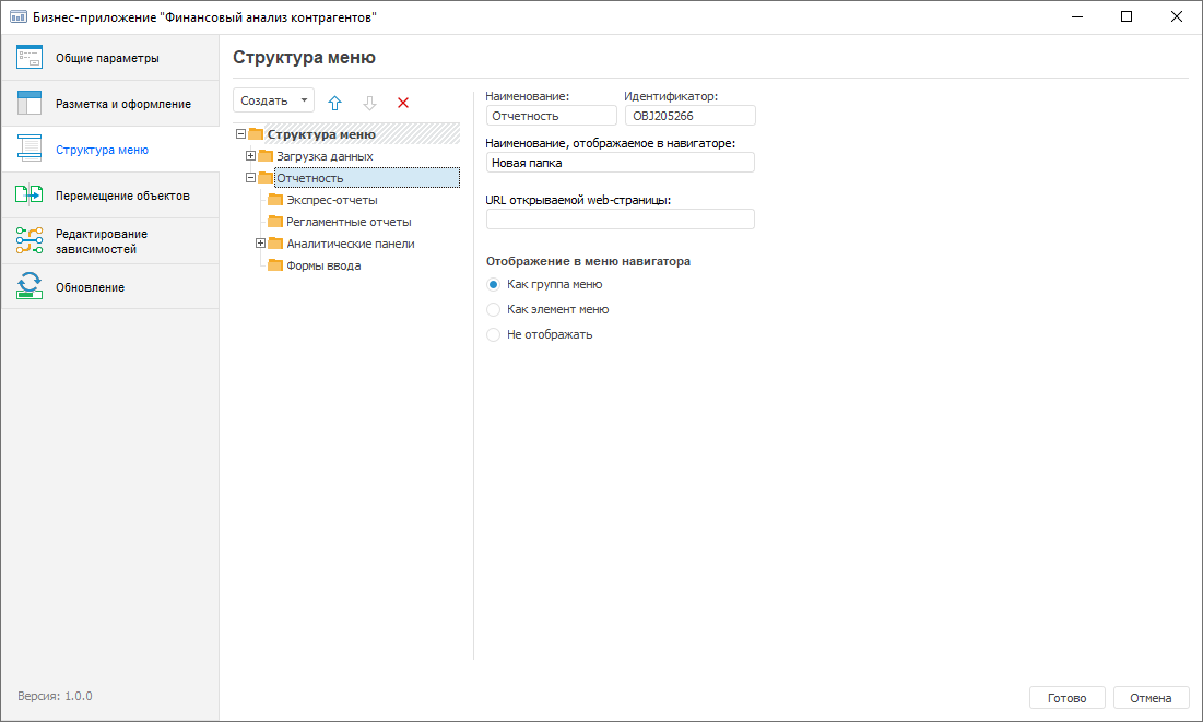 Web application side menu structure is created in the Menu Structure folder that is created by default on creating a business application and is used to set up display parameters for: