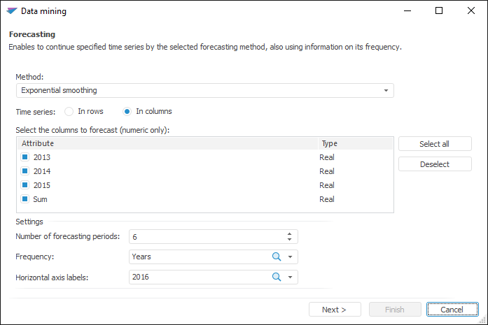 This type of analysis continues the specified time series by the selected forecasting method using information on its frequency.