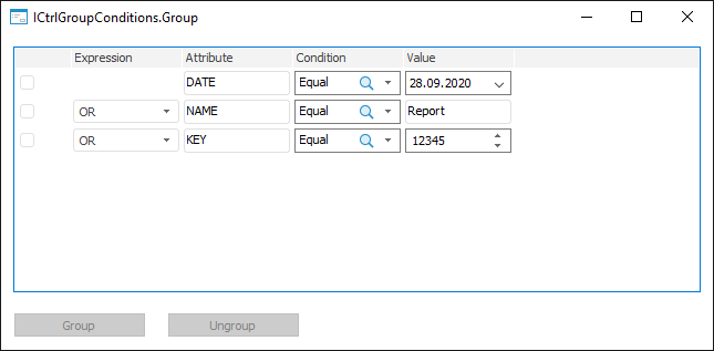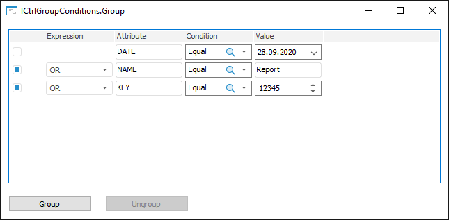 To execute the example, create a form given in the example for the ICtrlGroupConditions.AddRow method. Add two Button component named Button1 and Button2 on the form. For the Button1 component, set the Text property to Group, for the Button2 component, set the property to Ungroup. Set the Enabled property to False for the components.