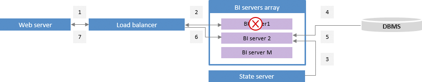 Therefore, a query from the client goes through the web server to the balancer. The balancer selects the BI server, and all queries from this client will be sent to the selected BI server. The BI server after query handling and referring to the DBMS will save parameters of all objects at the state server. If on executing a query the BI server failure occurred, the balancer will resend the query to another BI server, which will restore all necessary objects from the state server, execute the query and create the report for a user.