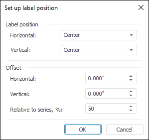 The Relative to Series, % setting is applied only to the series displayed as bars or sectors. This parameter is set to 50% by default. The maximum value for this parameter is 100%, which corresponds to edge of a column or a sector. When the parameter is set to 0%, the label is placed at the base of the column or sector; when the value is 100%, the label is placed at the top edge of the column or sector.