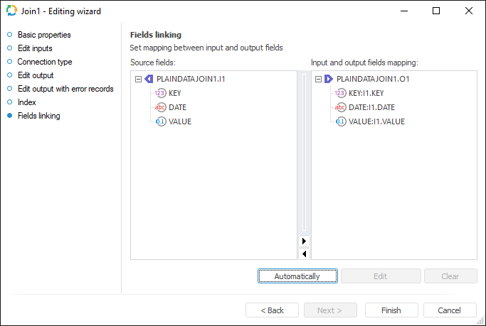 Creating field links automatically. It enables the user to create automatically links between all input and output fields with matching identifiers. Click the Automatically button to create links automatically.