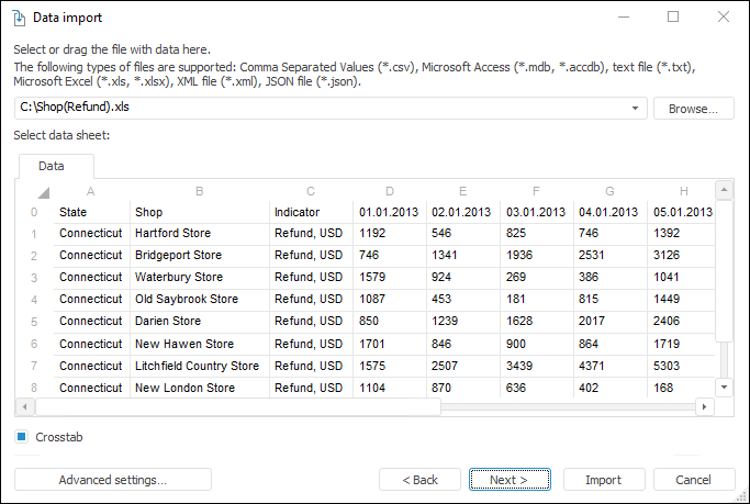 If the Crosstab checkbox is selected, additional pages of the wizard are displayed, where the user can set up and identify data in the crosstab. A crosstab is a summary table, where the headers can be located both by rows and by columns, which enables the user to show the relation between two or more variables.