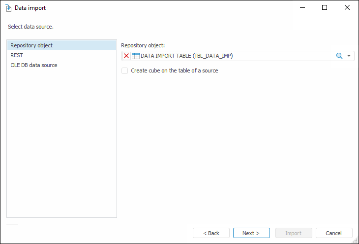Selecting the Create Cube on the Table of a Source checkbox enables the user to create a standard cube with binding to the selected data source. By default the checkbox is deselected, a new table is created, and data from the selected source will be imported to the table.