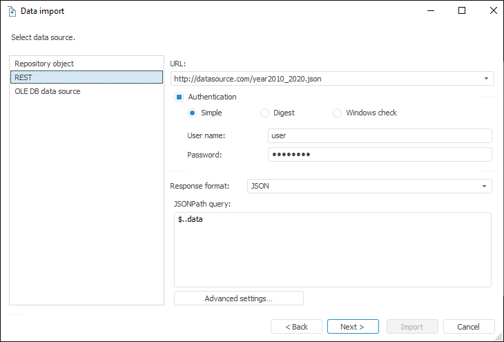 Use the URL box to specify URL of the REST service that gives data (the current implementation supports connection to REST services that give data only in the JSON and XML formats). If user authentication is required to connect to REST service, select the Authentication checkbox and select user check method. Specify user credentials in the User Name and Password boxes. The specified parameters are passed to the core, appropriately processed and used on connection to REST service.