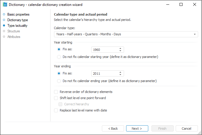 To build this type of dictionary, it is not necessary to create tables and link table elements. The user only needs to select calendar levels, whereas elements and their interaction are generated by the system: