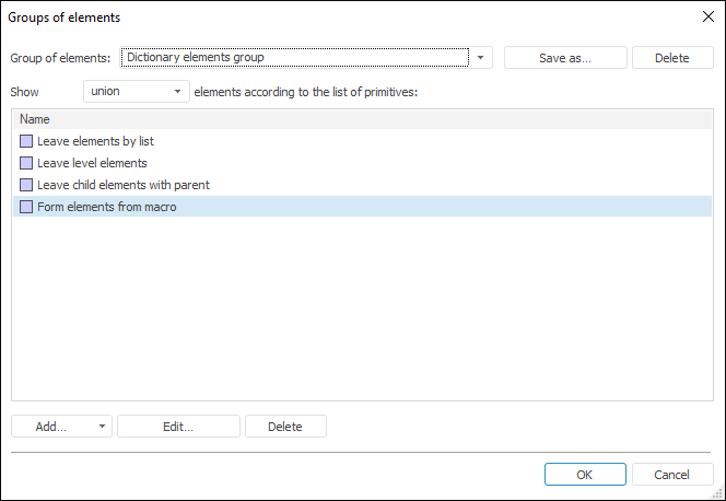 A group of elements is a repository object used in dictionaries to limit the list of available elements. Groups of elements are created as dictionary children and are not shown in the object navigator.
