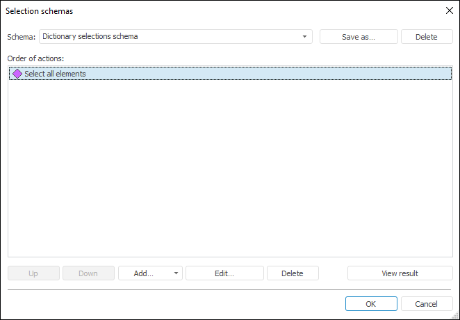 Selection schema is a repository object used in dictionary to automatically select elements based on specified criteria. Selection schemas are created as dictionary children; they are not displayed in the object navigator, but can be used in all the objects that use the parent dictionary.