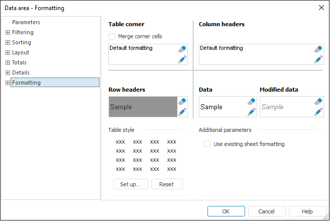 The Formatting tab is used to determine general formatting parameters of the data area: format of table corner, column headers (heading), row headers (sidehead), data, and changed data. These are default settings that can be redetermined for any level of any data area dimension.