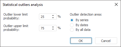 Determine probability used to calculate lower and upper percentile of data sample. Outliers are the values that are less than lower percentile and greater than the upper one. Use the fields: Outlier Lower Border Probability and Outlier Upper Border Probability.