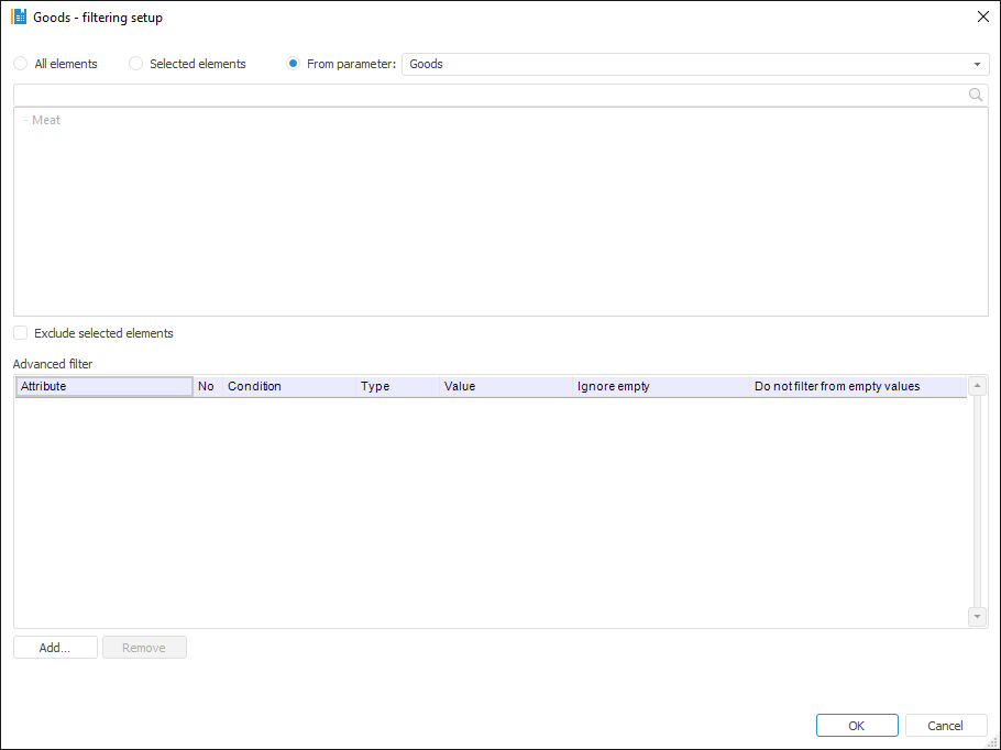To select dimension elements, by which a block should be calculated, use the Set Up Filtering dialog box: