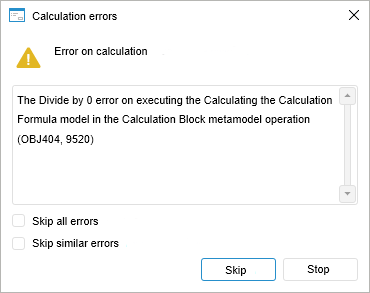 To skip the error, click the Skip button. After that calculated elements will be skipped and the calculation result is the empty value.