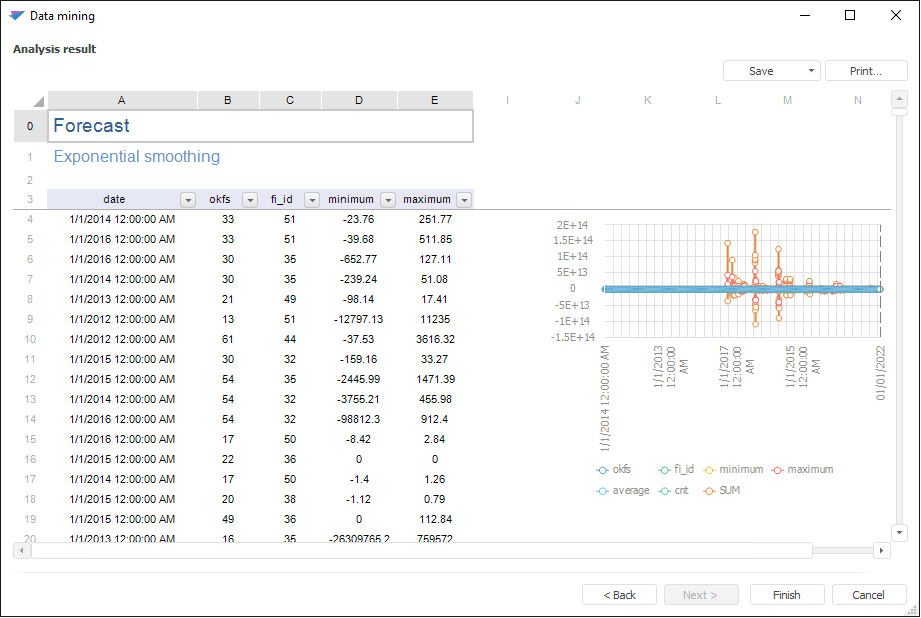 This type of analysis continues the specified time series by the selected forecasting method using information on its frequency.