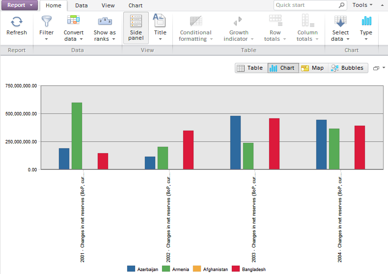 On changing chart, map, table or bubble chart settings from the tool ribbon, the selected settings are applied to chart. Sizes of the components will change on browser window resizing.