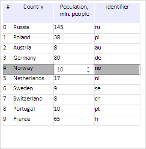 Double click the Country column cell of the row with the 4 index. As a result, editor is activated in the cell: