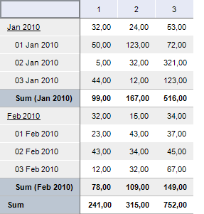 After executing the example the totals (sum of values) are calculated for the table by all hierarchy levels: