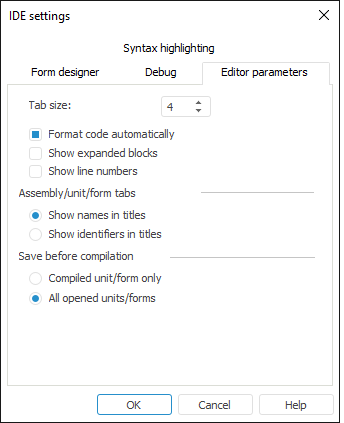 The Assembly/Unit/Form Tabs area is used to select the format for displaying tabs of opened development environment objects. By default, the titles show names of opened objects.