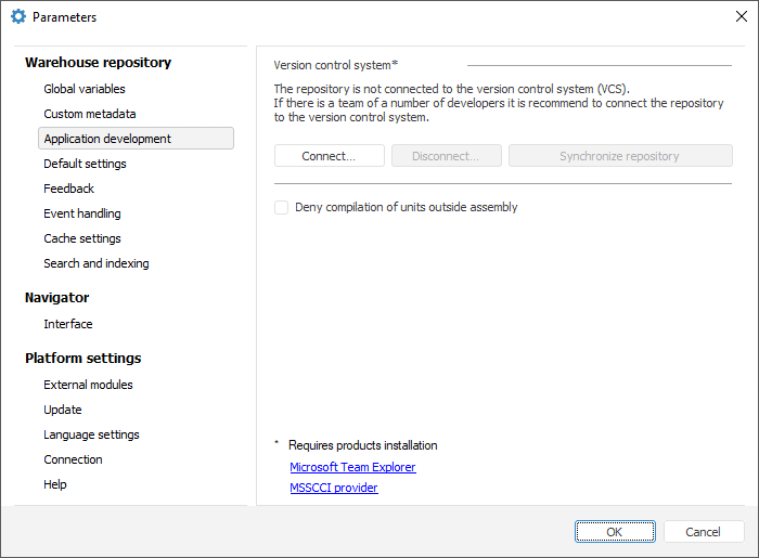 NOTE. The users, whose workstations have not been set up to work with version control system, will use object versions stored in the repository. In this case the Application Development tab in the Parameters dialog box looks identically to the tab appearance after the repository is connected to version control system.