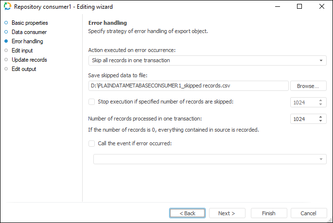 A file used to store skipped records can be specified on selecting the Skip Only Incorrect Records or Skip All Records In One Transaction actions.