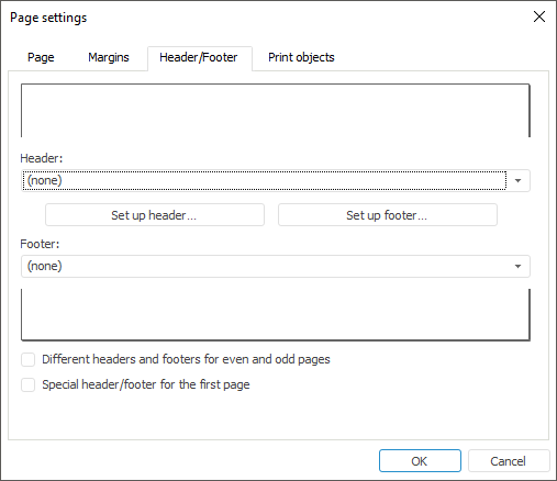 To show displaying options on printing headers and footers, select the Report > Print > Page Settings main menu item.