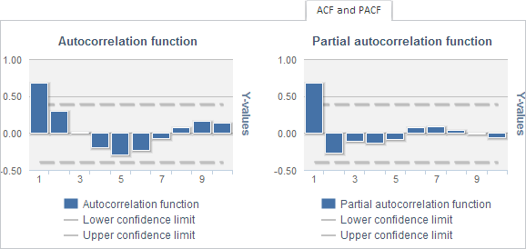 The ACF and PACF tab contains results of autocorrelation analysis: values of the autocorrelation function and the partial autocorrelation function for the output variable. Confidence interval limits are shown with a dotted line.