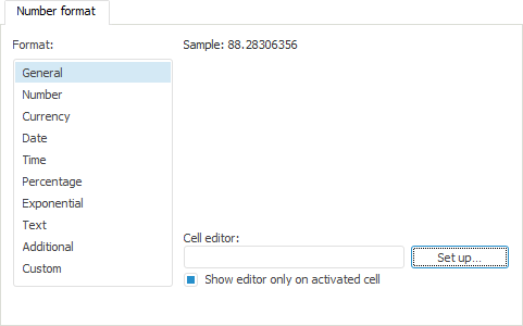 The tab contains the list of predefined formats for displaying sheet cells contents. Select required data format and set its parameters. Tab appearance and settings depend on the tool in use.