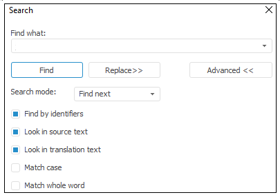 The focus is moved to the first found resource, which value can be replaced. To replace the current resource and search the next one, click the Replace button.
