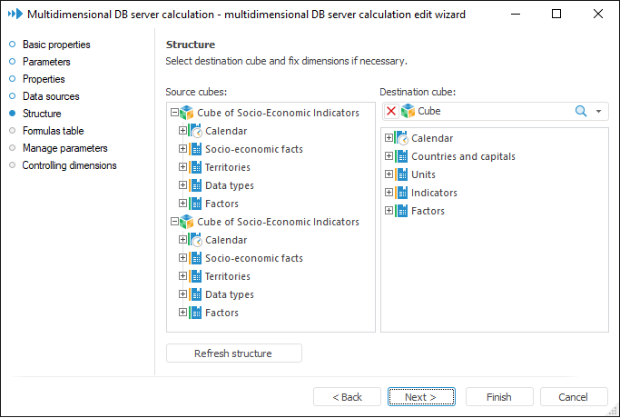 A source cube dictionary is fixed, but a destination cube dictionary matched to it is not fixed. When creating a destination cube dictionary elements can be used, calculation is performed only for destination dimension points, for which a calculation formula is determined.