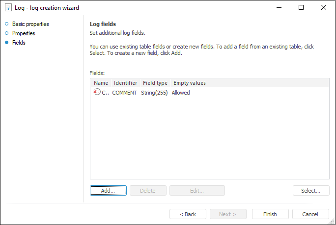 It is also available to add a new field into the log table from existing tables. To do this, click the Select button and open the Table Selection dialog box. In this dialog box it is required to select the table all fields of which must be written to the list of log fields.
