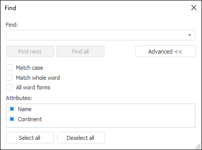 All Word Forms. If the checkbox is selected, word declension is ignored when searching elements, that is, whole words defined in the search field are searched for. For example, if you enter "region" into the search field, the search results contain all elements, which have attribute values containing the word "region". If the checkbox is deselected, the results include all elements, which have attribute values containing words like "region", "regional", "regions", and so on.