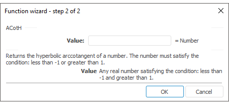 Value. Real value, hyperbolic inverse cotangent of which should be found. The value must satisfy the following condition: less than -1 or more than 1 (excluding -1 and 1).