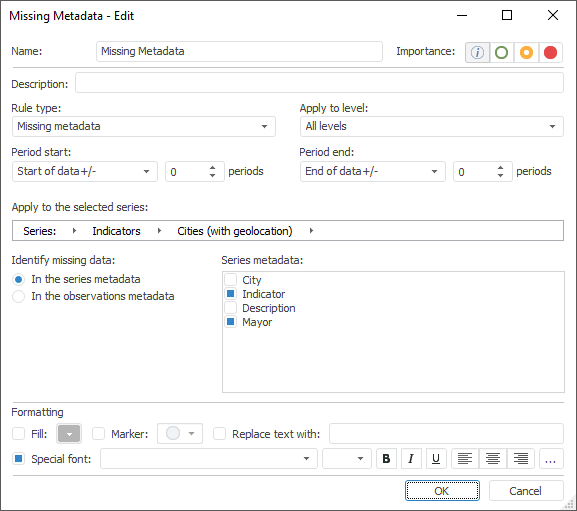 Determine attributes checked for missing data. Use the Series Metadata or Attribute Metadata list containing all available attributes. If attribute checkbox is selected, its values are checked for missing data.