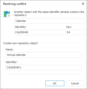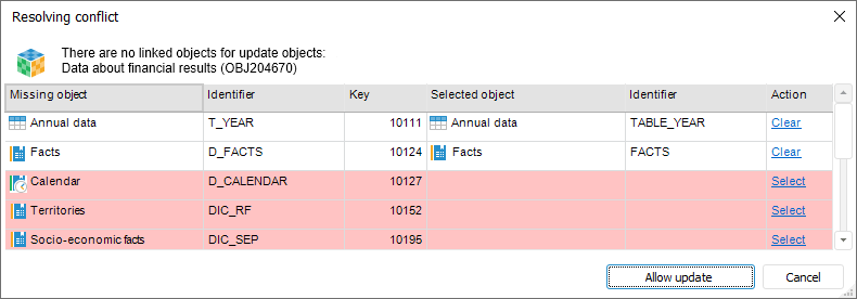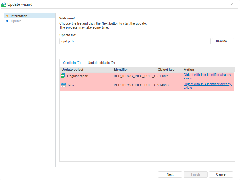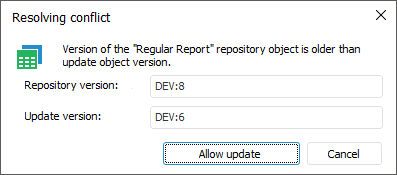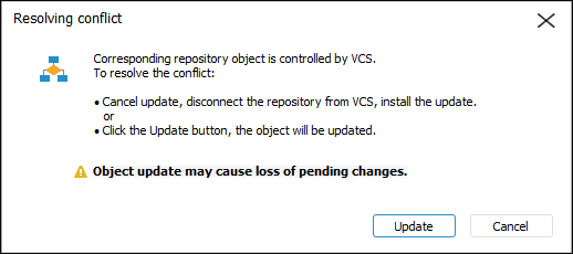 Corresponding object is controlled by VCS. The conflict occurs if the update contains objects added to version control system. To resolve the conflict, click the hyperlink in the Conflict box and confirm the update: