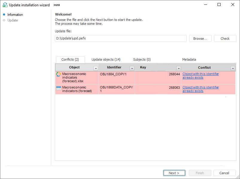 The Conflicts tab of the Information page displays different conflicts (except for the mandatory access control conflicts), which occur during the update check: