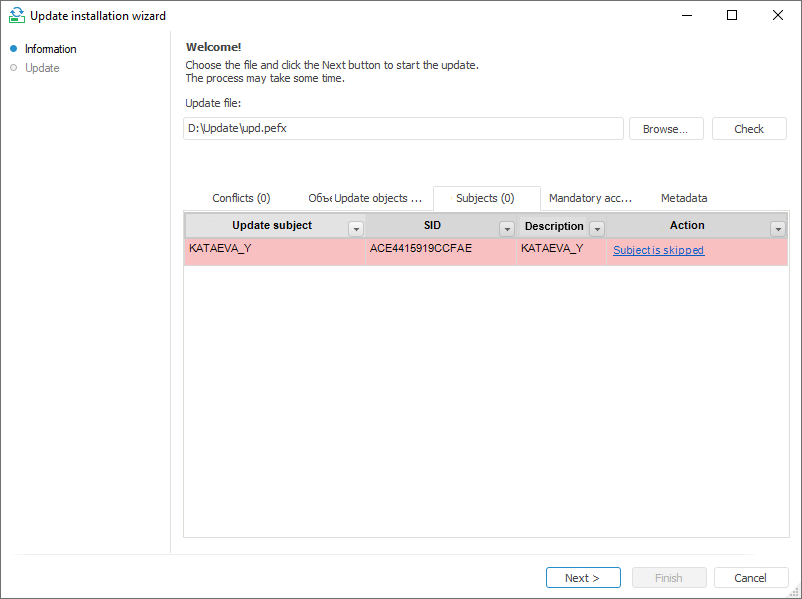 The Subjects tab on the Information page displays the list of security subjects, for which access permissions are updated, but on checking subjects from update were not compared to the repository security subjects. Security subjects without access permissions to the update objects but included in the update file are displayed on the Update Objects tab.