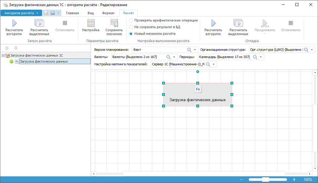 Перенос данных выполняется путём запуска служебного алгоритма «Загрузка фактических данных 1С» с идентификатором ALG_LOAD_FACT_DATA_FROM_1C, который интегрирован в качестве шага процесса формирования фактических бюджетных показателей «Комплексный расчет факта бюджетной модели».